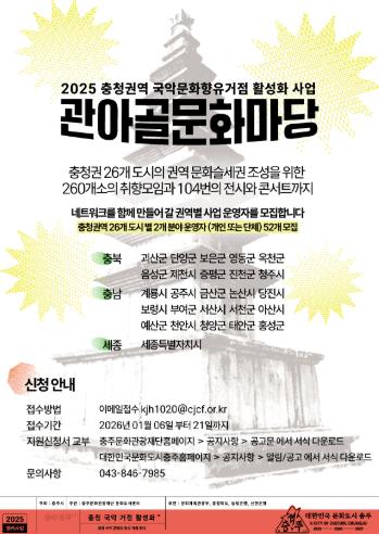 [뉴스앤톡] 충주문화관광재단과 충주시는 정부의 지방시대 핵심 비전인 ‘5극 3특(5대 초광역권 및 3대 특별자치도)’ 전략에 발맞춰, 충청권역의 문화적 연대를 강화하고 지역 균형 성장을 견인할 '충청권 국악문화향유거점 활성화 사업' 운영자를 오는 21일까지 공개 모집한다.