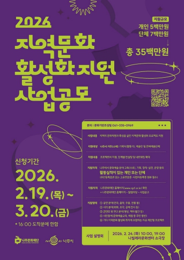 나주문화재단은 ‘2026 지역문화 활성화 지원사업’ 공모를 오는 3월 20일 오후 4시까지 진행한다고 19일 밝혔다.
