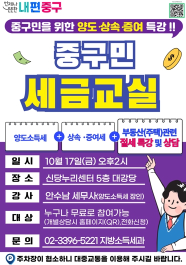 [뉴스앤톡] 서울 중구가 어렵게만 느껴지는 세금에 대한 이해를 돕기 위해 오는 17일 오후 2시 신당누리센터 5층 대강당에서 '중구민 세금교실' 특강을 연다.
