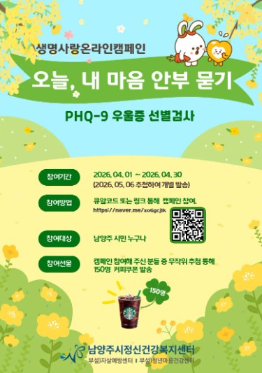 우울증 선별검사와 정신건강복지센터 인식조사 방식으로 진행하며, 남양주 시민이면 누구나 함께할 수 있다.