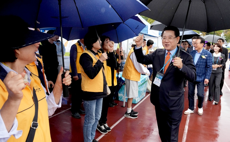| ▲ 김영록 전라남도지사가 18일 광주광역시 상무시민공원에서 열린 ‘재광완도군향우회 제13회 한마음체육대회’ 행사에서 향우회원들을 격려하고 있다. |