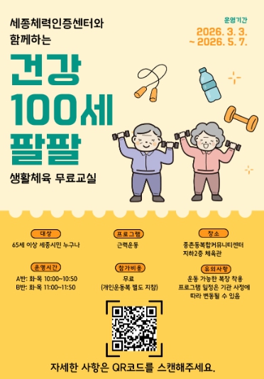 [뉴스앤톡] 세종특별자치시체육회는 세종특별자치시 및 세종체력인증센터와 함께 65세 이상 시민을 대상으로 진행하는 「건강 100세 팔팔 생활체육 무료교실」 참가자를 모집한다.