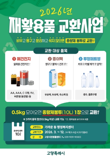 교환 대상 품목은 폐건전지, 종이팩, 투명페트병 등 3개 품목이며, 고양특례시는 3월부터 변경된 교환 기준을 적용한다.