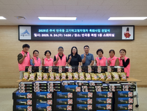이날 행사에는 ▲한누리식당 김 25상자, ▲세종강남농협 반곡지점 쌀 1㎏ 40포, ▲새나루 12단지 송편 20상자가 기탁됐으며, 반곡동지역사회보장협의체가 자체 사업으로 마련한 고기묶음 20개를 전달했다.
