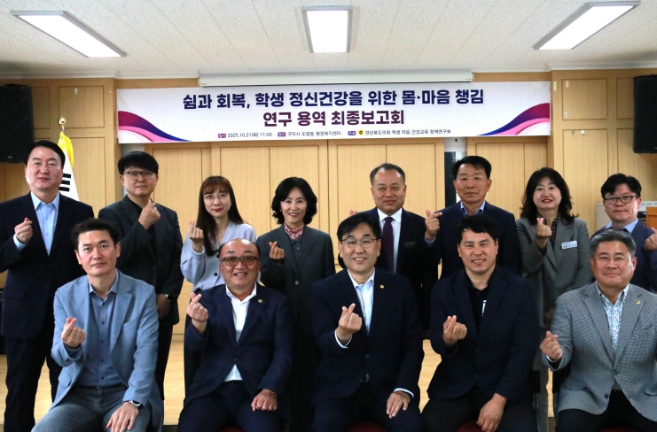 [뉴스앤톡] 경북도의회 의원연구모임인'경상북도 학생 마음건강 교육 정책연구회'(대표 황두영 의원)는 10월 21일 구미시 도량동 행정복지센터에서 ‘쉼과 회복, 학생 정신건강을 위한 몸·마음 챙김 연구용역’ 최종보고회를 개최했다.