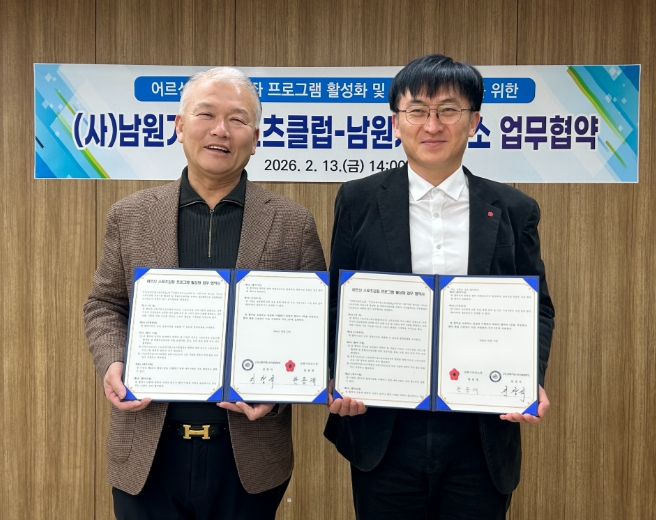 [뉴스앤톡] 남원시보건소는 2월 13일 (사)남원거점스포츠클럽과 함께 지역 어르신들의 스포츠 참여 기회를 확대하고 통합적인 건강관리 서비스를 제공하기 위한 업무협약(MOU)를 체결했다.