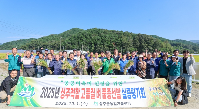 [뉴스앤톡] 성주군농업기술센터는 10월 1일 성주군 수륜면 소재 벼 품종비교포에서 성주군 쌀전업농회를 비롯한 농업인과 관계자 등 50여 명이 참석한 가운데 '2025년 고품질 벼 품종선발 실증시험포 평가회'를 개최했다.
