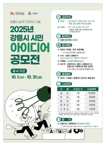 [뉴스앤톡] 강릉시는 강릉시 승격 70주년을 맞아 시민의 창의적이고 혁신적인 의견을 시정에 반영하기 위해 ‘2025년 강릉시 시민 아이디어 공모전’을 10월 1일부터 10월 31일까지 31일간 개최한다.