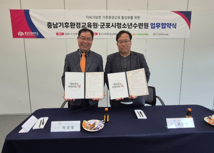 [뉴스앤톡] (재)군포시청소년재단이 운영하는 군포시청소년수련원(충남 청양)과 충남기후환경교육원(충남 청양)은 4월 9일, 미래세대의 지속가능 기후환경교육 활성화를 위한 업무협약을 체결했다고 전했다.