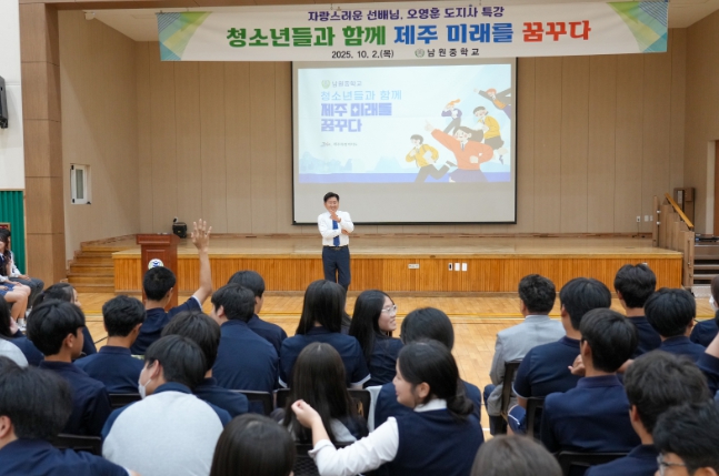 [뉴스앤톡] 오영훈 제주특별자치도지사는 2일 남원중학교(교장 오경석)를 찾아 전교생을 대상으로 특별강연을 열고, “남원과 제주를 넘어 아시아, 나아가 우주까지 여러분의 무대가 돼야 한다”며 청소년들의 꿈과 도전을 격려했다.