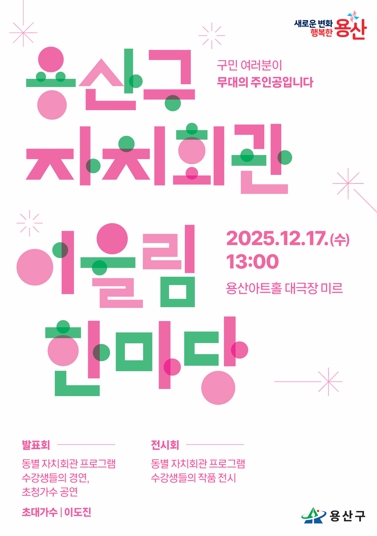 [뉴스앤톡] 서울 용산구가 17일 용산아트홀 대극장 미르에서 한 해 동안의 자치회관 운영 성과를 공유하고 주민 화합을 도모하는 ‘2025년 자치회관 어울림한마당’을 개최한다.