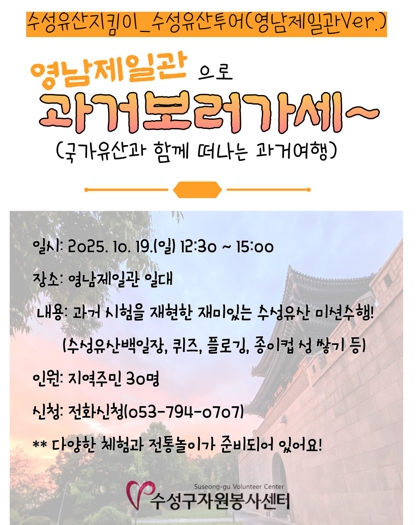 [뉴스앤톡] 수성구자원봉사센터 소속 수성유산지킴이는 오는 19일 영남제일관 일대에서 지역 주민을 대상으로 한 문화 체험 프로그램 ‘영남제일관으로 과거 보러 가세’를 진행한다.