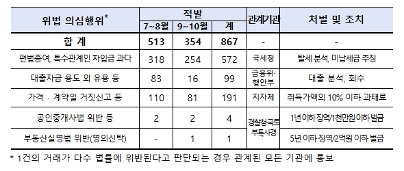 이번 기획조사는 대출규제 강화, 토지거래허가구역 확대 등 시장 안정화 대책이 본격적으로 실행됨에 따라, 편법 대출·증여나 토지거래허가 위반 등 시장질서를 교란하는 이상거래가 확대될 우려에 대비하여 서울 및 경기 일부지역(6곳)에 한정했던 ’25.1월~6월 조사와 달리 해당 지역 외에 경기 9곳을 추가 확대하여 ‘25.7월 ~ 10월 거래 신고분에 대해 실시했으며,이상거래 총 2,255건을 조사하여 위법 의심거래 746건(위법의심행위 867건)을 적발했다.