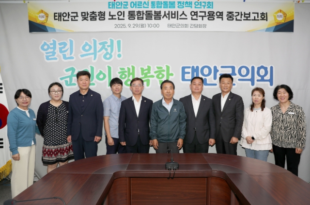 [뉴스앤톡] 태안군의회 의원연구단체 ‘태안군 어르신 통합돌봄 정책 연구회’는 9월 29일 오전 10시, 태안군의회 간담회장에서 '태안군 맞춤형 노인 통합돌봄서비스 정책 연구' 중간보고회를 개최했다.