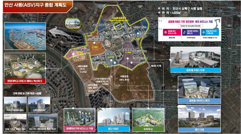 ASV 경제자유구역은 안산시 상록구 사동 산166번지 일원 1.66㎢(약 50만 평) 규모로, 한양대 ERICA를 중심으로 경기테크노파크, 한국생산기술연구원, 한국산업기술시험원, 한국전기연구원 등 국책 연구기관과 강소기업이 집적된 수도권 대표 산학연 클러스터다.