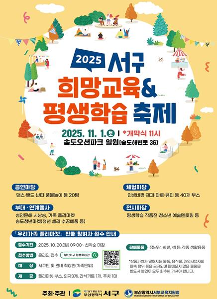 [뉴스앤톡] 부산 서구는 오는 11월 1일 송도오션파크에서 서부교육지원청과 공동으로 '2025년 서구 희망교육 & 평생학습 축제'를 개최한다.