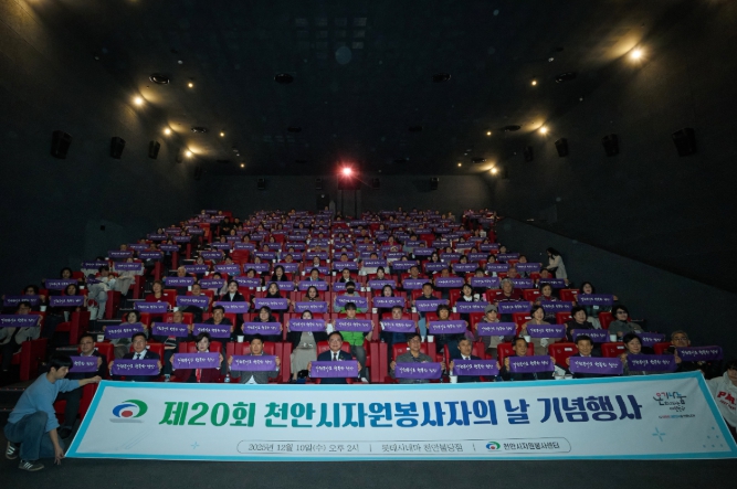 [뉴스앤톡] 천안시자원봉사센터는 10일 롯데시네마 천안불당점에서 ‘제20회 천안시자원봉사자의 날 기념행사’를 열고, 지역사회를 위해 헌신한 자원봉사자들의 노고를 격려했다.