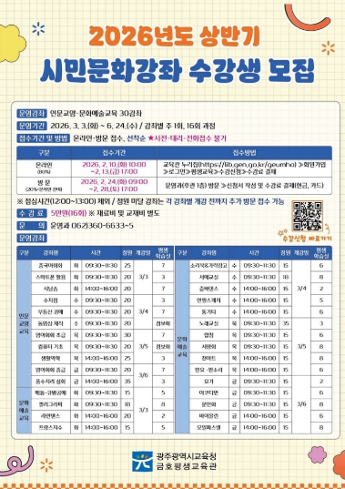 [뉴스앤톡] 광주시교육청금호평생교육관은 오는 3~6월 ‘2026년 상반기 시민문화강좌’를 운영한다.