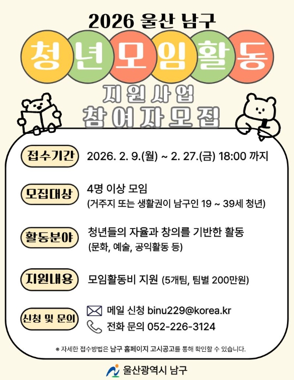 [뉴스앤톡] 울산 남구는 2026년 청년모임활동 지원사업인 ‘남구청년, 이모저모’의 참여팀을 모집한다.