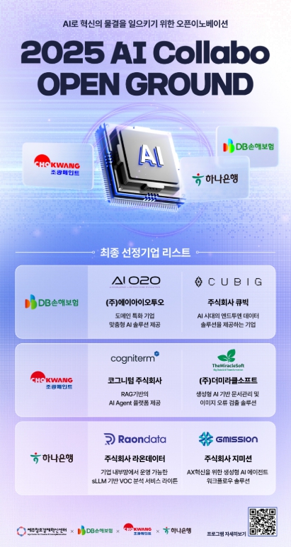 [뉴스앤톡] 제주창조경제혁신센터(대표이사 이병선, 이하 제주센터)는 DB손해보험, 조광페인트, 하나은행과 함께 추진하는 특화산업 오픈이노베이션 ‘2025 AI 콜라보 오픈그라운드 프로그램’을 통해 최종 6개 스타트업을 선정하고, 기술 테스트와 솔루션 개발을 통해 실질적인 사업화 협력에 나선다.