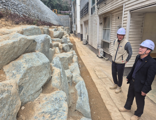 ▲산호공원 사면 보강공사는 `24년 9월 21일 마산합포구 일원 누적강우량 493.3mm에 달하는 극한호우로 인해 전도된 옹벽을 항구 복구하는 공사로, 총공사비 817백만원을 투입하여 합벽식 옹벽 75m, 게비온 옹벽 48m를 설치하여 사면을 안정화하고, 배수로 174m를 설치하여 배수 기능을 대폭 개선했다. 현재 공정률은 95%이며, 3월말 완공을 앞두고 현장 마무리 작업 중에 있다.