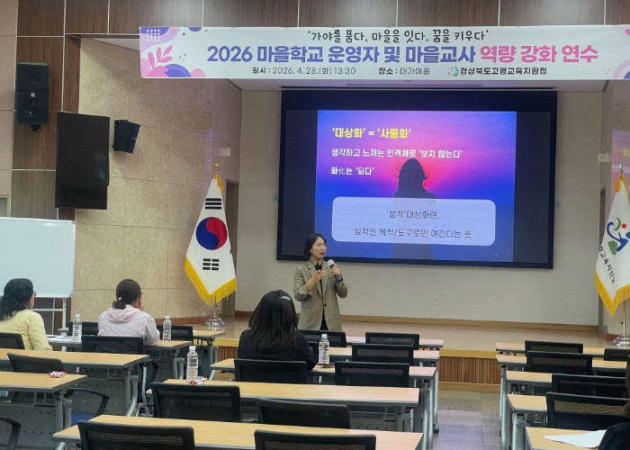 [뉴스앤톡] 경상북도고령교육지원청은 4월 28일 오후 1시 30분, 고령교육지원청 대가야홀(3F)에서 관내 마을학교 운영자 및 마을교사를 대상으로 ‘2026 고령미래교육지구 마을학교 운영자 및 마을교사 역량강화 연수’를 개최했다.