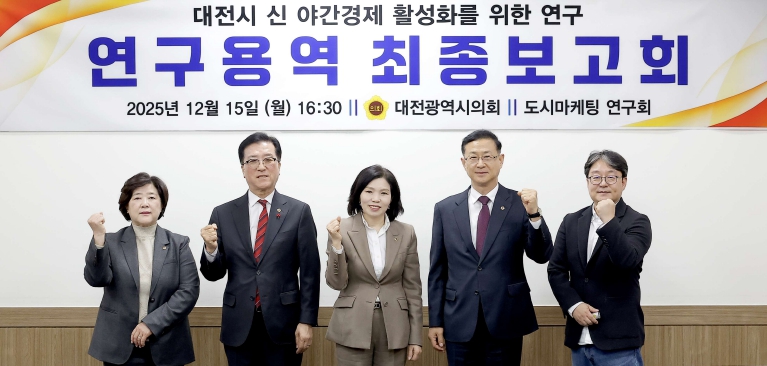 이날 보고회에는 연구회장인 이금선 의원을 비롯해 민경배 의원(국민의힘, 중구3), 안경자 의원(국민의힘, 비례), 조원휘 의원(국민의힘, 유성구3)이 참석해 연구 용역 수행을 맡은 김주호 이사(한국문화관광포럼)로부터 연구 용역 결과에 대한 발표를 청취했다.