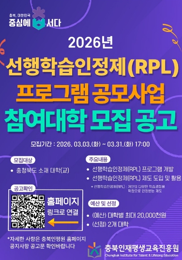 [뉴스앤톡] 충북인재평생교육진흥원은 2026년 선행학습인정제(RPL) 프로그램 공모사업에 참여할 도내 대학을 공개 모집한다.