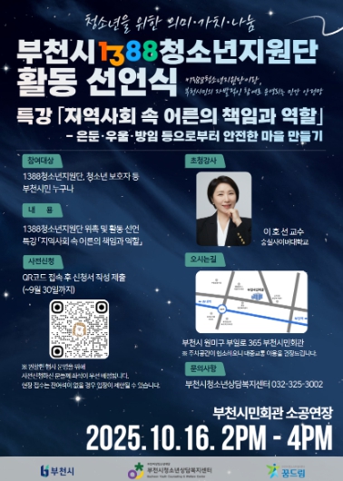 이번 활동 선언식은 부천시가 주최하고 △부천형1388청소년지원단 위촉장 및 지정서 수여, △부천형1388청소년지원단 활동 선언 퍼포먼스, △이호선 교수(숭실사이버대학교)의 '지역사회 속 어른의 책임과 역할'의 주제 특강으로 이어질 예정이다.