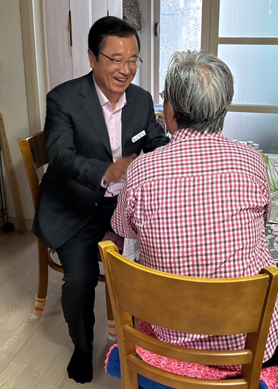 ▲ 이현재 하남시장이 취약계층 가정에 직접 찾아 격려하고 생활 불편 사항을 살피며 안부를 확인하고 있다.