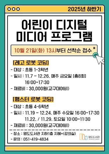 [뉴스앤톡] 영도도서관에서 어린이복합문화공간의 디지털 교육환경을 기반으로 관내 어린이들의 디지털 역량 강화와 창의력 향상을 위한 ‘2025년 하반기 어린이 디지털 미디어 프로그램’을 운영한다.
