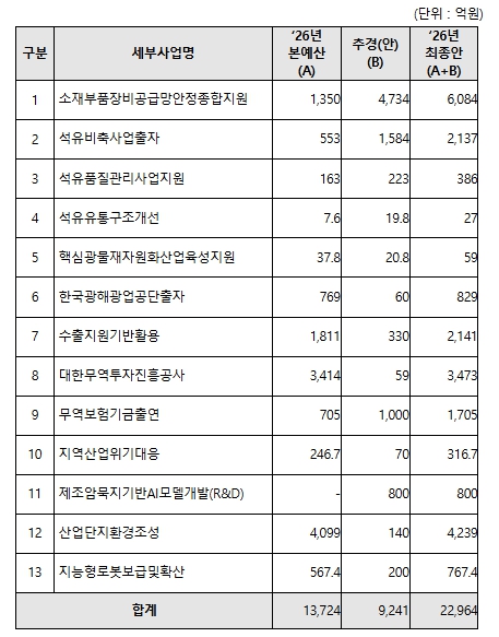 ▲ 2026년 산업통상부 제1회 추가경정예산안 관련 사업