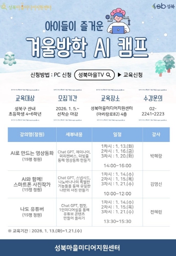 [뉴스앤톡] 서울 성북구 성북마을미 디어지원센터가 오는 13일부터 21일까지 미디어 체험 프로그램인 ‘겨울방학 AI 캠프’를 운영한다.