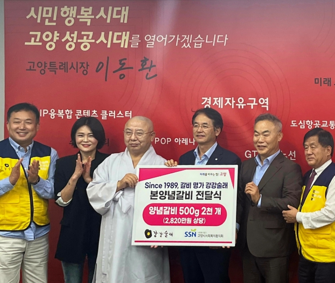 [뉴스앤톡] ㈜전한의 외식브랜드 강강술래(대표 노상환)가 10월 10일, 고양특례시에 본양념갈비 500g 2,000개(2,820만 원 상당)를 기탁했다. 이번 전달식은 고양특례시청 열린시장실에서 진행됐으며, 이동환 고양특례시장, 김민숙 고양특례시의원(고양, 관산, 원신), 노상환 강강술래 대표, 김응화 고양시사회복지협의회 회장이 함께 자리했다.