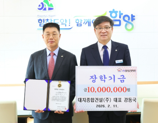 [뉴스앤톡] (재)함양군장학회는 2월 11일 대지종합건설(주) 강동국 대표가 함양군 지역 학생들을 위해 장학금 1,000만 원을 기탁했다고 밝혔다.