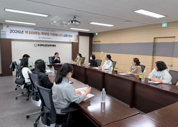 [뉴스앤톡] 경상북도김천교육지원청은 4월 3일 김천교육지원청 회의실에서 관내 책 읽어주는 학부모 자원봉사자를 대상으로 '2026년 책 읽어주는 학부모 자원봉사자 심화 연수'를 실시했다.