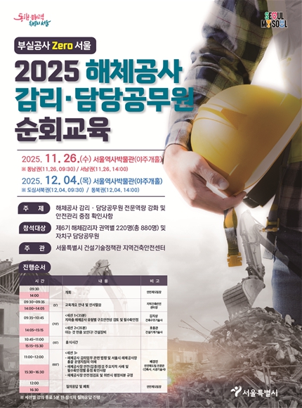 [뉴스앤톡] 서울시는 2025년 11월 26일과 12월 4일, 서울역사박물관 야주개홀에서 해체공사 감리·담당공무원 순회교육을 진행한다고 밝혔다. 해체공사 위험요인을 근본적으로 차단하기 위해 현장에서 즉시 적용 가능한 해체공사 실무 중심 역량강화 안전교육이 진행되며 제6기 해체공사 감리자 및 자치구 해체공사 인허가·상시점검 담당 공무원이 대상이다.
