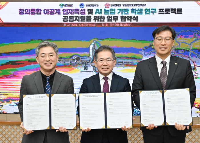 [뉴스앤톡] 군위군이 1월 2일 군청 제2회의실에서 군위고등학교, 경북대학교 밭농업기계개발연구센터와 함께 창의융합 이공계 인재 육성 및 AI 농업 기반 이공계 인재 육성을 위한 학생 연구 프로젝트 공동 지원 업무협약을 체결했다.