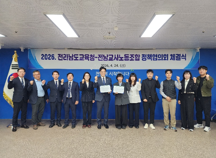 [뉴스앤톡] 전라남도교육청과 전남교사노동조합(위원장 김신안)은 24일 전라남도교육청 중회의실에서 ‘2026년도 정책협의회 체결식’을 갖고, 건강한 교육 생태계 조성을 위한 공동의 노력을 약속했다.