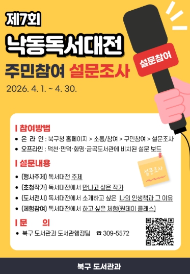 [뉴스앤톡] 부산 북구는 오는 4월 1일부터 30일까지 한 달간 2026년 제7회 낙동독서대전 개최를 위한 구민 의견수렴 설문조사를 실시한다고 밝혔다.