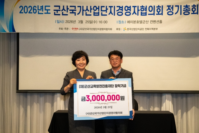 금번 기탁식은 25일 (사)군산국가산업단지경영자협의회 정기총회 현장에서 진행됐으며, 협의회 회원사들의 뜻을 모아 마련된 장학금이 재단 측에 전달됐다.