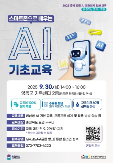 [뉴스앤톡] 충북도와 충북과학기술혁신원(원장 고근석)은 도민들의 인공지능 활용 역량을 높이기 위해 오는 9월 30일 오후 2시부터 4시까지 영동군 가족센터 2층에서 '스마트폰으로 배우는 AI 기초교육'을 개최한다.