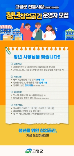 고령군, 전통시장 내 청년창업공간 운영자 모집