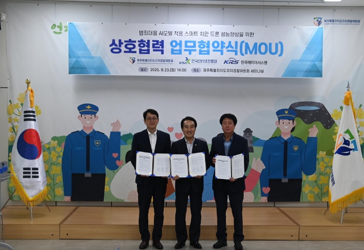 제주자치경찰위원회(위원장 박영부)는 23일 한국인터넷진흥원(KISA), 한국레이더시스템과 인공지능 성능 고도화를 위한 업무협약(MOU)을 체결하고 본격적인 범죄예방 인공지능(AI) 드론개발에 나선다고 밝혔다.
