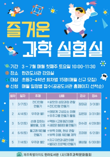 [뉴스앤톡] 제주특별자치도 한라도서관은 오는 3월부터 7월까지 매월 첫째 주 토요일 초등학생을 대상으로 기초과학 체험 프로그램 ‘즐거운 과학 실험실’을 운영한다.