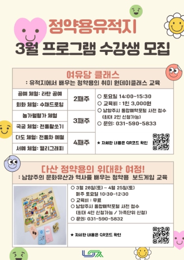 한편 이번 3월 프로그램 참여를 희망하는 시민은 남양주시 통합예약포털을 통해 온라인 신청이 가능하다. 자세한 사항은 통합예약포털 내 공지 사항을 확인하거나 남양주시 다산평생학습과로 문의하면 된다.