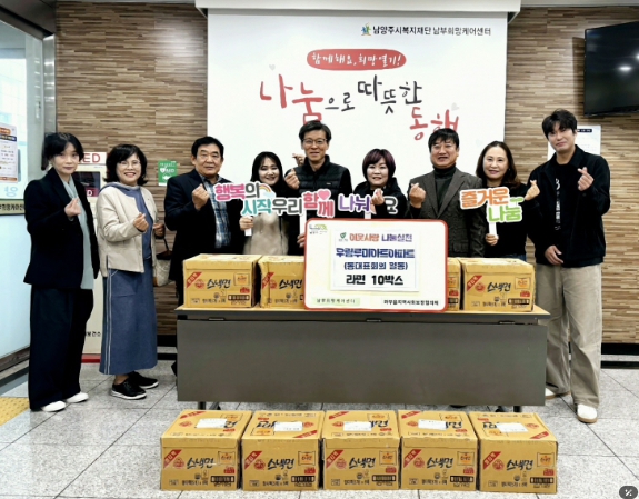 [뉴스앤톡] 남양주시는 지난 7일 와부읍 우림루미아트아파트 입주자대표회의(회장 이추우)가 지역 내 어려운 이웃을 위해 라면 10박스를 남부희망케어센터에 기탁했다고 10일 밝혔다.