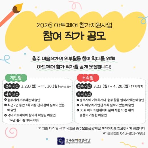 개인형 지원 대상은 공고일 이전 최소 6개월 이상 충주시에 주소지를 둔 예술인으로, 최근 7년간 전시 참여 실적이 7회 이상이고 2026년 2월부터 11월에 개최하는 국내 아트페어에 참가가 확정된 자이다.