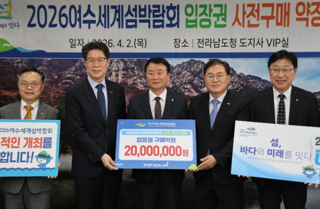 [뉴스앤톡] (재)2026여수세계섬박람회조직위원회는 4월 2일 전남도청 VIP실에서 탑솔라㈜와 ‘2026여수세계섬박람회 입장권 구매약정식’을 개최했다고 밝혔다.