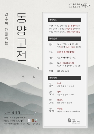 오는 4월 7일부터 28일까지 매주 화요일 오전(10:30~12:30)에는 안상헌 강사의 ‘알수록 재미있는 동양고전’이 열린다. 자칫 딱딱하고 어렵게 느껴질 수 있는 고전을 현대적 관점에서 재해석해, 현대인들이 실생활에서 적용할 수 있는 지혜를 나누는 시간이 될 전망이다.